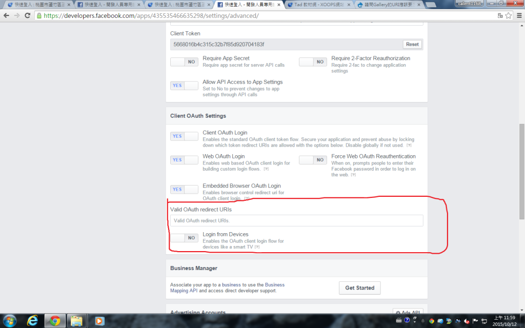 感謝老師上次關於系統設定的回覆。個人目前正嘗試安裝使用快速登入模組,但在facebook的進階設定時選取"「Emberedded browser OAuth Login」"後出現了訊息"Client OAuth login is enabled but you haven't listed any valid OAuth redirect URIs."