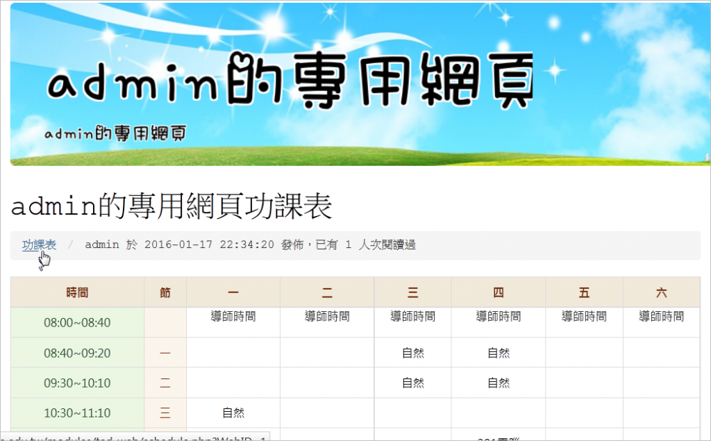 2.前台新增課表分類,再新增好課表後,回班網首頁顯示的是行事曆,無課表。網站首頁仍顯示尚未設定功課表,但我已在同一分類下新增2筆功課表,再點功課表進去,也看不到課表,只有新增課表的按鈕。