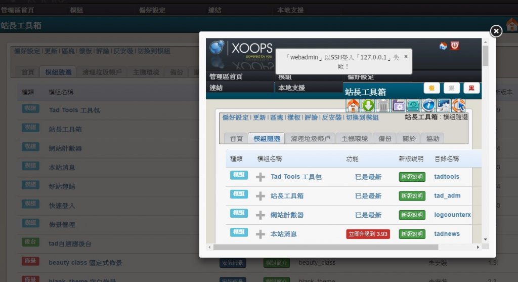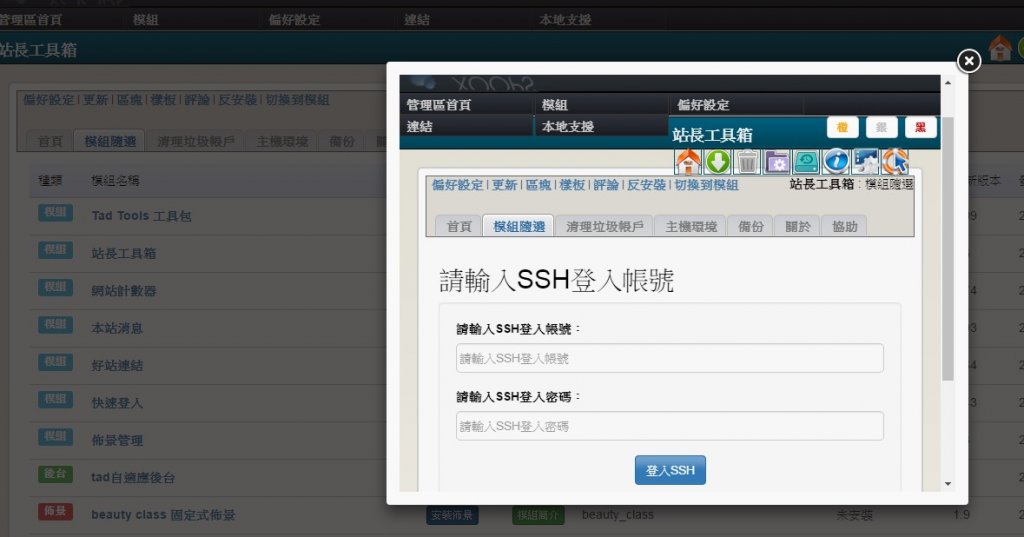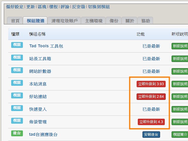 tad老師您好,請教您:我的情況如附件所示,欲更新部份模組時,卻一直無法登入,似乎是更新站長工具箱之後才出現,請問我可以如何解決呢?謝謝