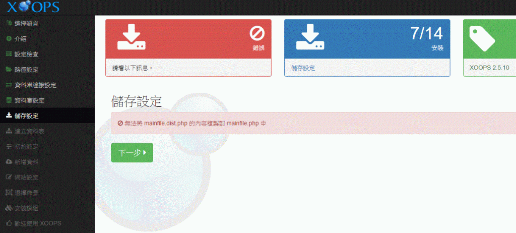 無法將 mainfile.dist.php 的內容複製到 mainfile.php 中。
