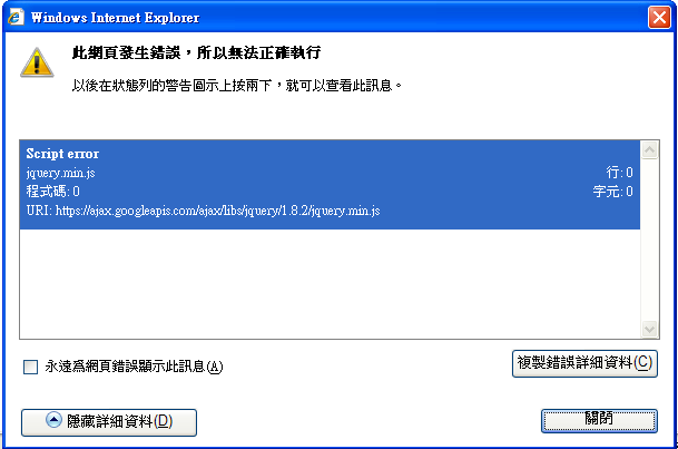 我的表單畫面如111.bmp,網頁其實有一個jquery的錯誤訊息,設定使用google jquery或tad工具包jquery都還是會有這樣的錯誤訊息,請教您要如何解決呢?謝謝