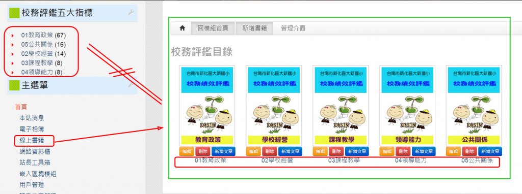 另外請教一下...如果我想在自訂區塊設定出現如圖中綠色框的頁面<就是顯示線上書籍的主畫面>,要填入什麼內容?
