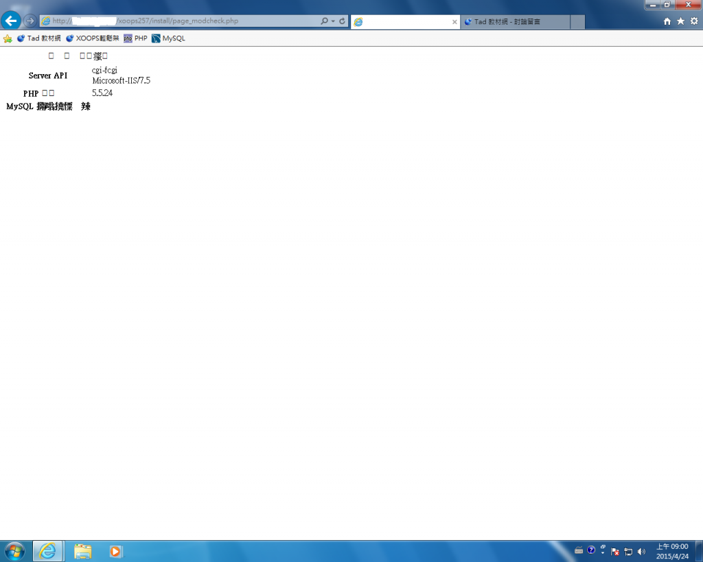 IIS7.5 已經建置,PHP 5.5.24已經建置(phpinfo測試OK),MYSQL5.6.24已經建置並啟動
