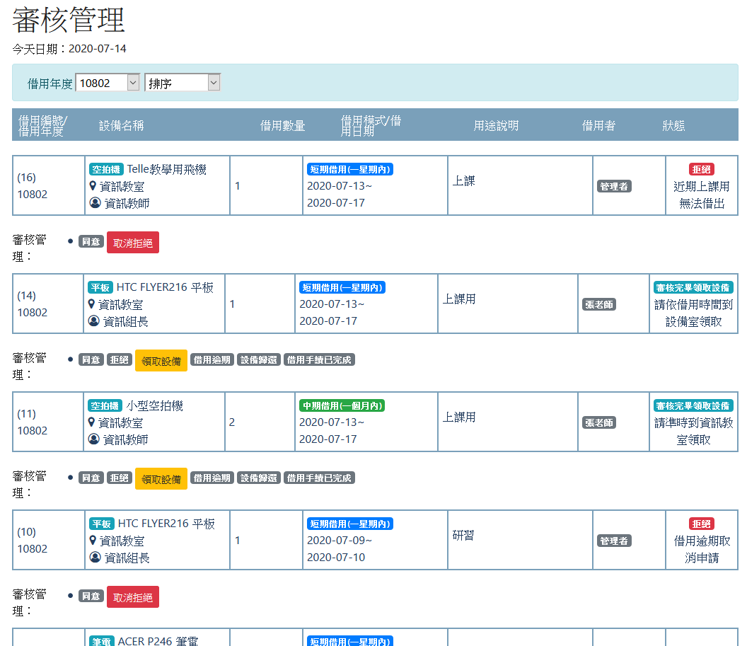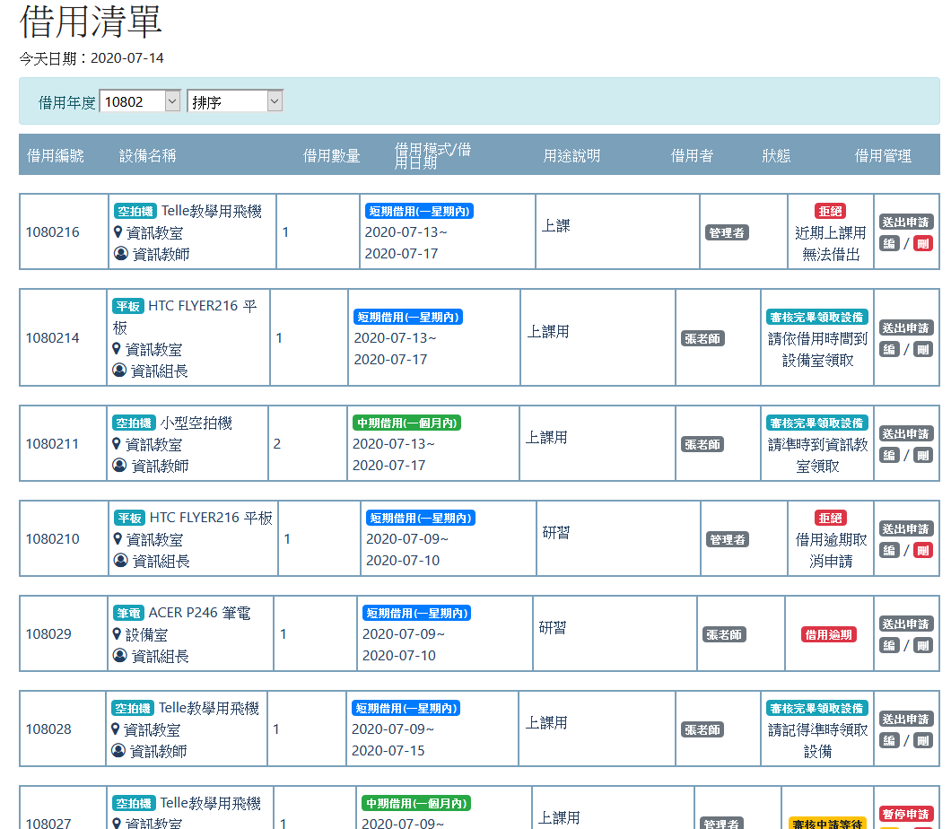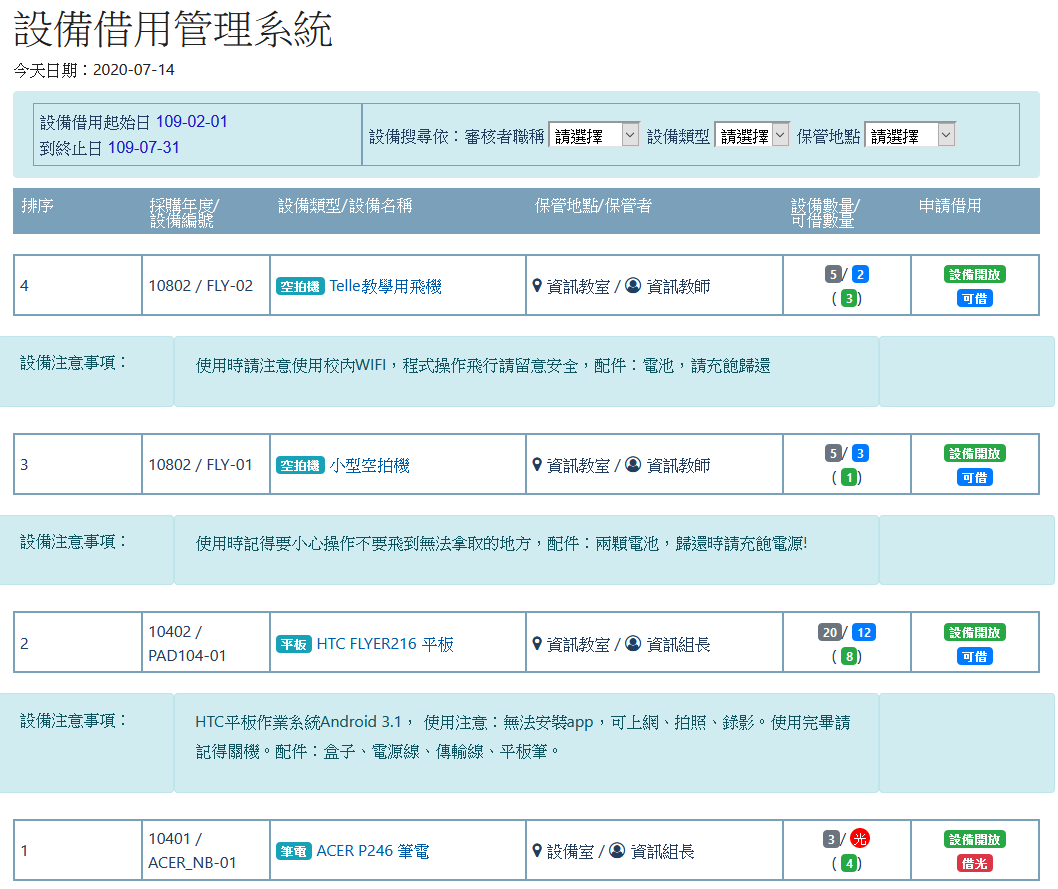1.更新設備借用架構,改成以學期或學年為單位請在"偏好設定"修改,借用不可跨期限。