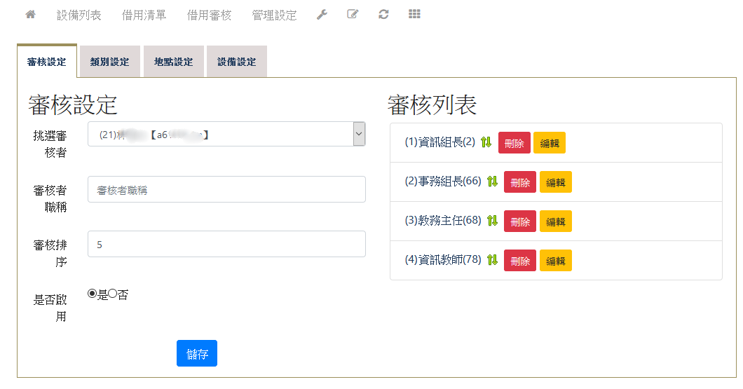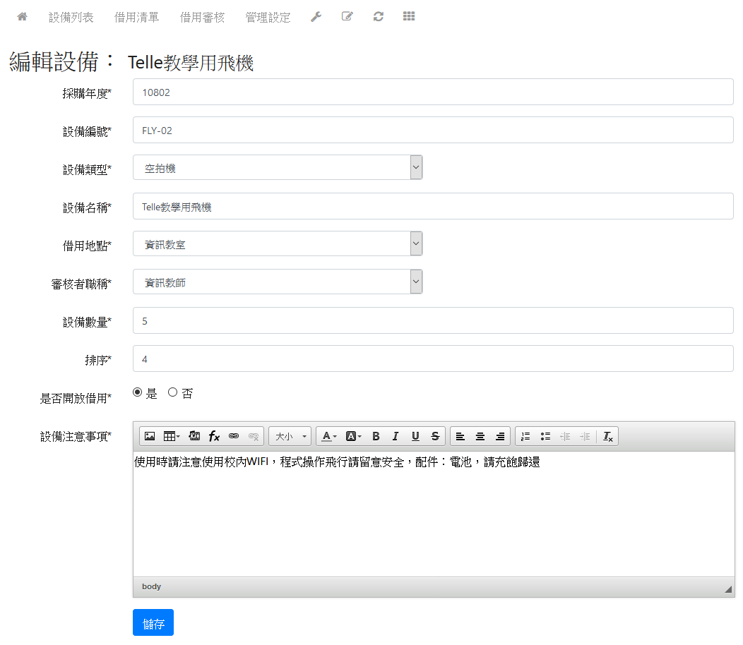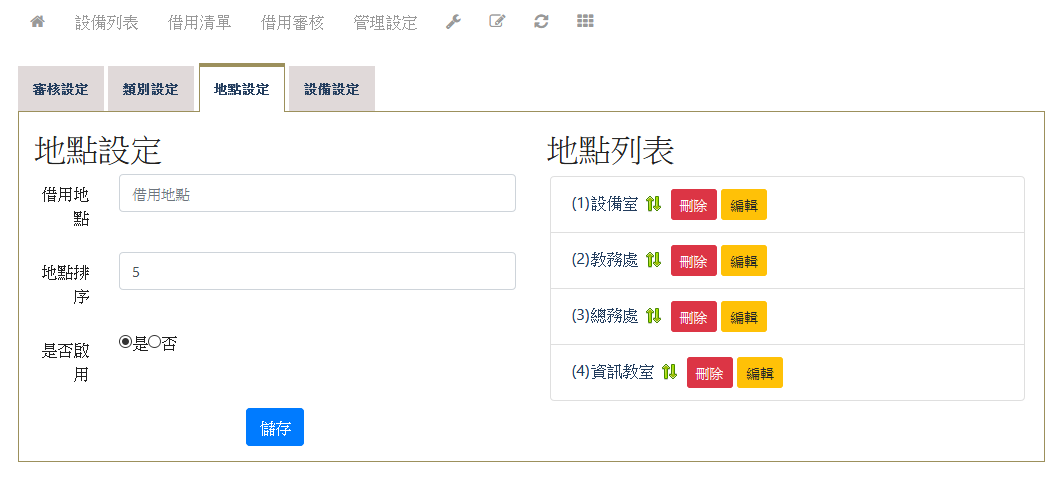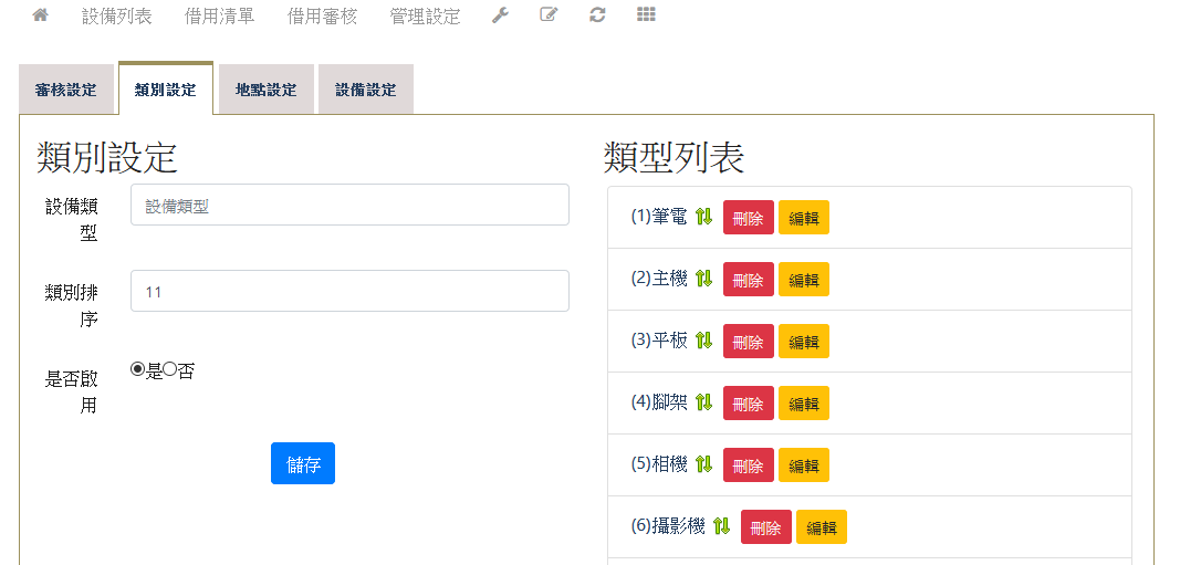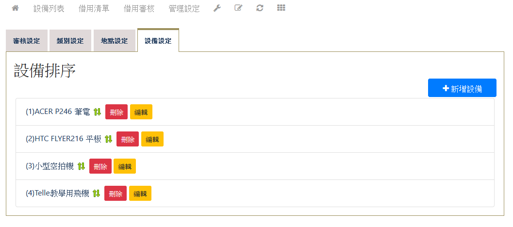 1.新增設備:新增可借用設備,可用啟用或不啟用決定是否開放借用設備。