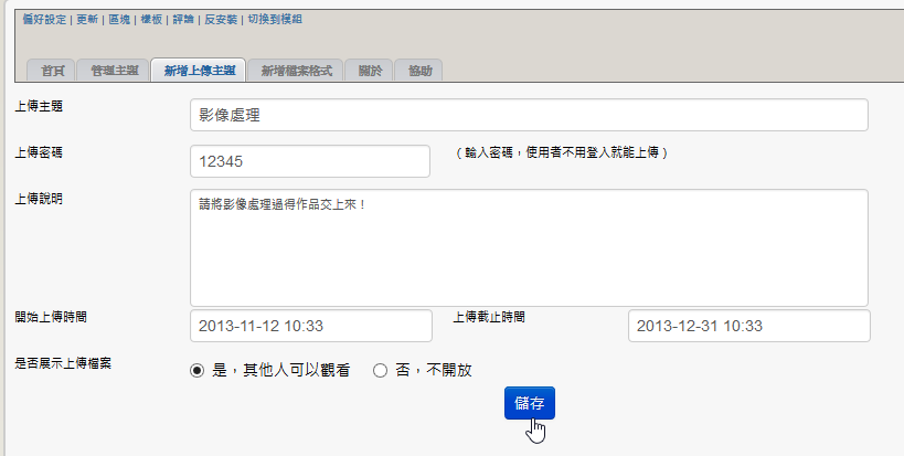 由於小弟在上電腦課時,常常會面臨請學生交作業的狀況。而小弟的學生從 9~70 歲都有,若要他們先去註冊帳號在來上傳檔案,那麼,對有些學員來說,是相當不便的。因此,寫了此模組,可讓上傳者不需要申請帳號密碼,只需輸入上傳密碼(上課當面告知),即可很容易的上傳。