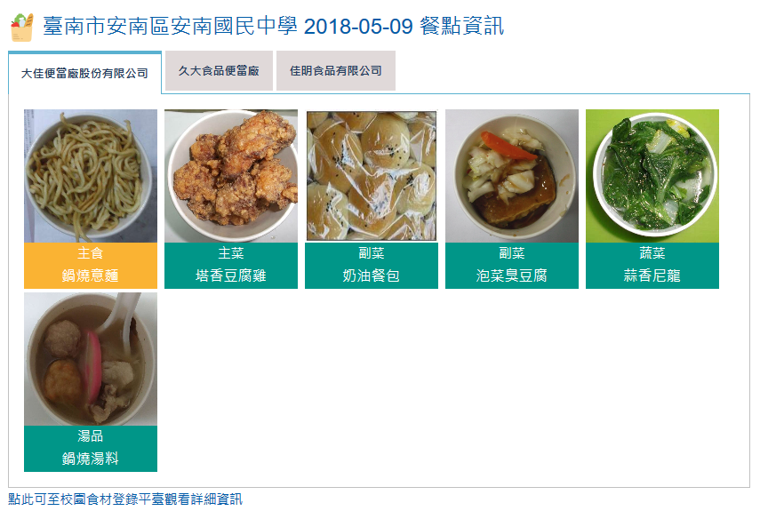 本模組可以直接從校園食材登錄平臺擷取午餐資訊,讓老師無須再一次輸入各種營養午餐資料。支援多校(如學校和附幼)、多供應商(一間學校多個供應商)、多餐(如幼兒園還有點心),全部只須到偏好設定設定學校編號即可。